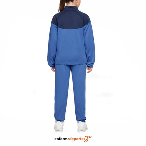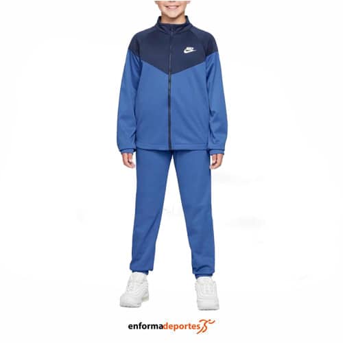 Chándal junior NIKE SPORTSWEAR DRI-FIT, confeccionado en tejido 100% poliéster con tecnología Nike Dri-FIT que absorbe el sudor de la piel para acelerar la evaporación, lo que ayuda a mantener la transpirabilidad y la comodidad. Compuesto de dos partes, parte superior chaqueta con cierre con cremallera completa, con bolsillos laterales y puños y dobladillo elásticos; la parte inferior, pantalones con pretina elástica con cordón ajustable, con bolsillos laterales y puños elásticos.