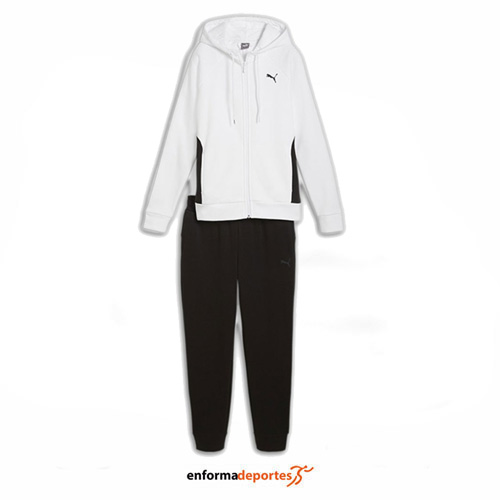 Chandal mujer PUMA CLASSIC HOODED TRACKSUIT, fabricado en algodón, este modelo esta compuesto de chaqueta y pantalón, algodón – 280.00 g/m², con capucha con cordón de ajustable, con cremallera completa, bolsillos laterales y puños y cintura elástica; con pantalon de corte recto, con puños elásticos y cintura elástica con cordón ajustable.