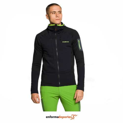 Chaqueta hombre TRANGO MONTRO, confeccionada en tejido poliéster reciclado elástico con capucha fija y contorno facial elástico, con costuras Flatlock (4 agujas), cuerpo entallado, mangas ranglán, cremallera longitudinal, ajuste elástico en bajo. Bolsillo pectoral con cremallera oculta, bolsillos ventrales y en manga con cremallera. Transpirable, bi-elástico, ajuste ergonómico.