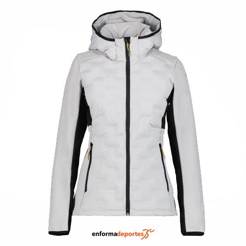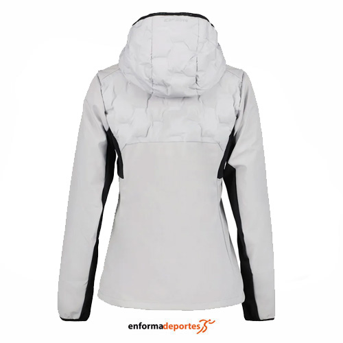 Chaqueta mujer ICEPEAK BURDEN, confecionada en tejido poliéster y elastano con acabado repelente al agua libre de PFC, capa intermedia de ajuste regular, con mangas raglán, con elástico alrededor de la abertura de la cara, puños elásticos, con 2 bolsillos delanteros con cremallera. Cierre frontal con cremallera completa.