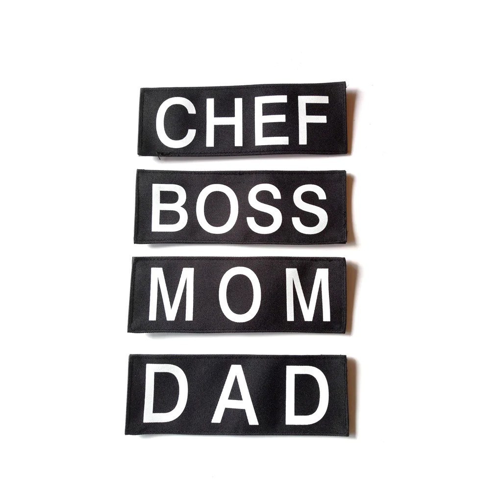 - Parches de nombre extraíbles, mamá, papá, chef y jefe.