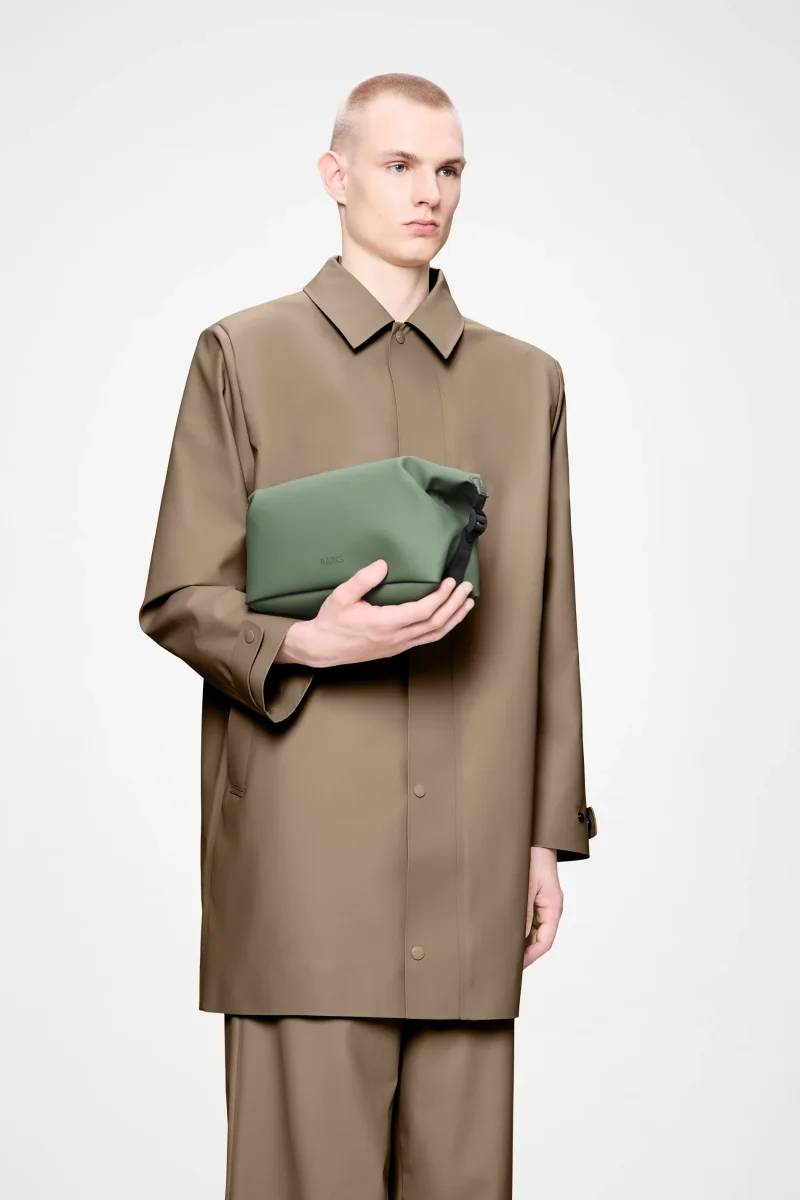 Hilo Wash Bag está confeccionado en el tejido de PU impermeable característico de Rains, creado para ofrecer robustez en el transporte, durabilidad y un suave acabado.