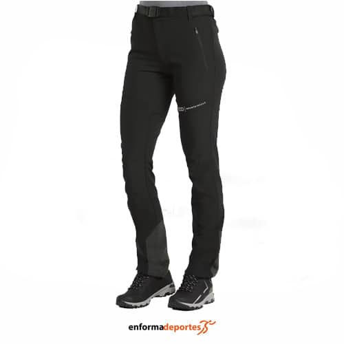 Pantalón mujer +8000 VALREAS, ideal para la práctica de trekking de corte ajustado, confeccionado en tejido biélástico calidad Shellflex,  con bolsillos superiores y bolsillo lateral con cremallera, rodillas preformadas, con cintura elástica con cinturón personalizado, bajos semi-elásticos con cremalleras laterales .