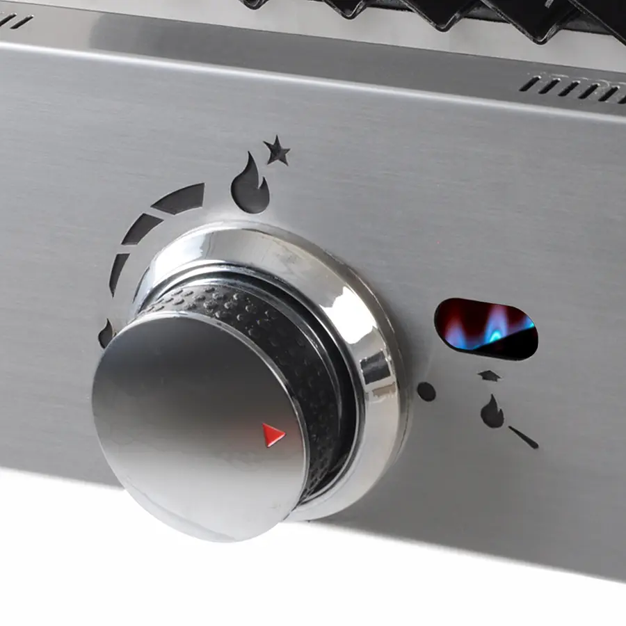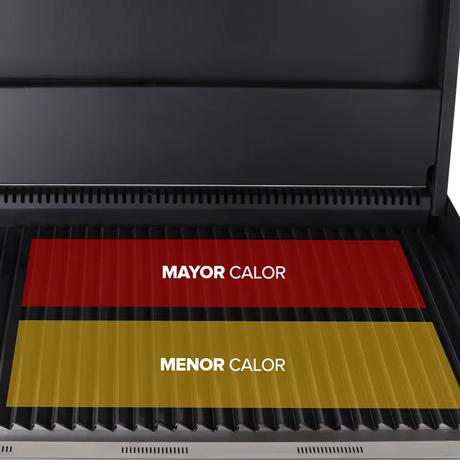 Las parrillas tienen zonas de calor ajustables: una alta y una baja, permitiendo controlar los términos de cocción sin cambiar la intensidad de la llama.