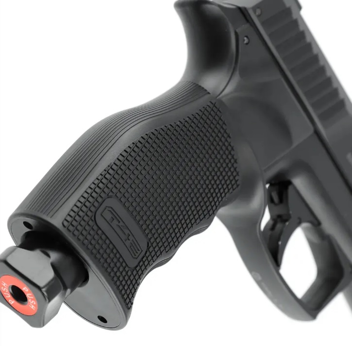 La pistola táctica (TP) 50 Gen2 es una potente pistola con MagFed y entrenamiento civil que se destaca por su confiabilidad y alta energía inicial. La versión de segunda generación de la probada TP 50 ha sido optimizada en diseño y función para un rendimiento superior y una disponibilidad operativa. Las características más importantes de esta actualización incluyen una textura de agarre optimizada, una mira de fibra óptica de alto contraste y un innovador sistema de perforación rápida sin herramientas con liberación de presión integrada. La cápsula de CO2 de 12 g en la empuñadura solo se perfora cuando es necesario y un ligero golpe en la parte inferior de la empuñadura es suficiente. De esta manera, los usuarios tienen la garantía de tener las cápsulas llenas y pueden estar seguros del mejor rendimiento incluso después de largos períodos de almacenamiento. Un indicador de presión que se puede ver y sentir claramente muestra si el marcador está listo para la acción. Cualquier presión restante se libera de manera fácil y segura con un cuarto de vuelta del tornillo en la parte inferior de la empuñadura. El TP 50 Gen2 también se basa en el probado sistema T4E, que ofrece una gran selección de balas redondas de calibre .50 y obtiene energía de una cápsula de CO2 de 12 g. La energía se ha incrementado a 13 julios para aumentar considerablemente la eficacia. Las seis balas se cargan en el cargador tubular situado debajo del cañón. Los elementos funcionales colocados de forma intuitiva y un diseño inteligente garantizan un manejo seguro en cualquier situación. El seguro del gatillo evita disparos accidentales y el riel Picatinny debajo del cañón puede albergar accesorios adicionales. El T4E TP 50 Gen2 también es totalmente compatible con los numerosos accesorios T4E existentes. Adecuado para todas las balas redondas calibre .50 T4E