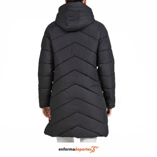 Plumas mujer +8000 SIRIANA, con relleno sintético de imitación pluma natural, combinado con un tejido 100% poliéster 50D tratado para repeler el agua, con prácticos bolsillos laterales con cremalleras para mayor seguridad, una capucha integrada de diseño envolvente que protege del frío, y una cremallera frontal de doble cursor que facilita su ajuste y uso.