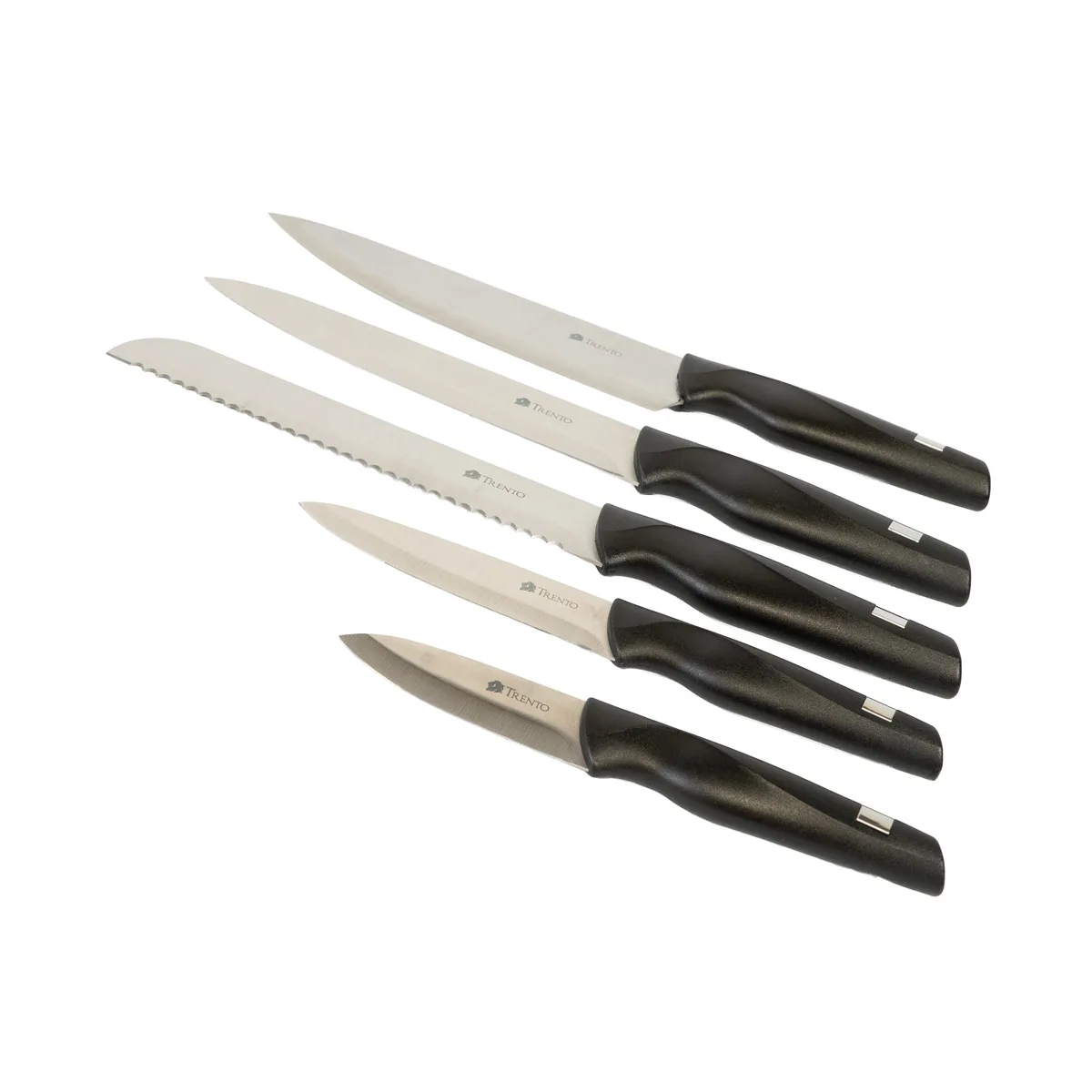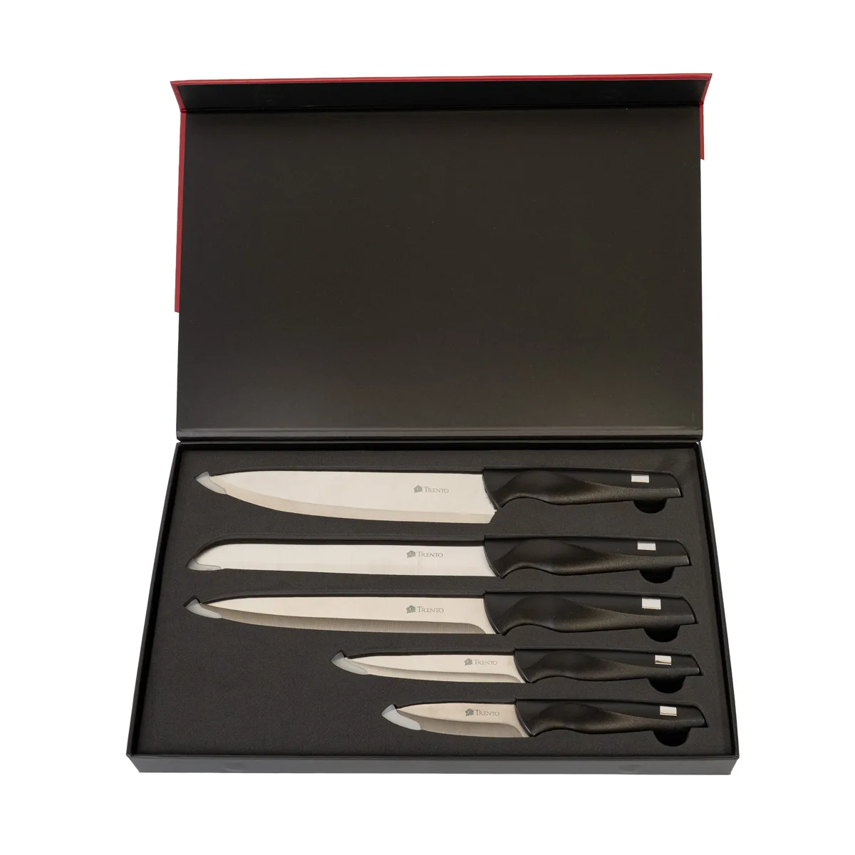 El set Trento Daily Giftbox es la opción ideal para quienes buscan calidad profesional y una presentación impecable. Este conjunto de cinco piezas ha sido diseñado para cubrir todas las necesidades de corte en el hogar, utilizando hojas de acero inoxidable 420 que garantizan un filo liso de gran precisión y alta durabilidad. La estructura de cada cuchillo asegura un desempeño óptimo en el uso cotidiano, manteniendo su integridad ante la exigencia de la cocina moderna.