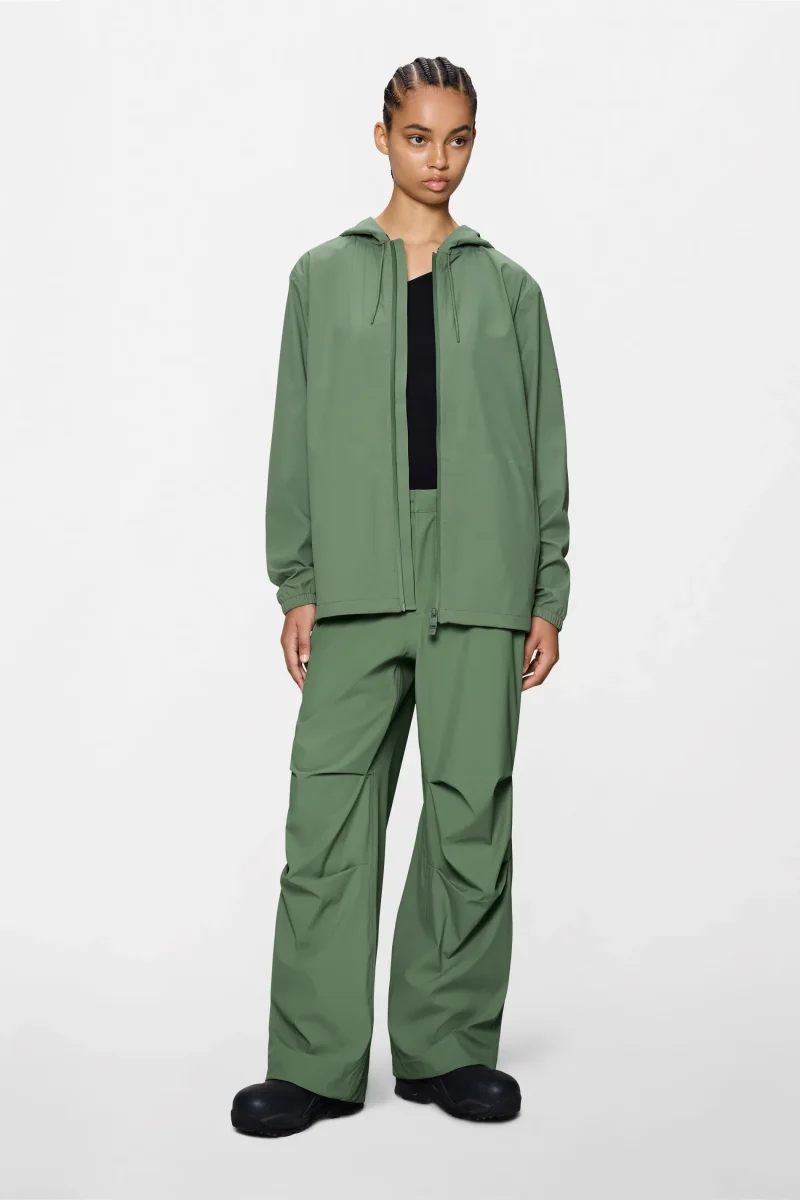 La chaqueta está diseñada con bolsillos laterales con cierre de cremallera y puños elásticos. Un detalle engomado con la marca añade un toque de contraste a su acabado minimalista.