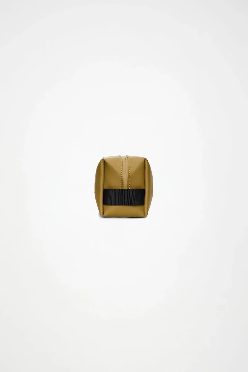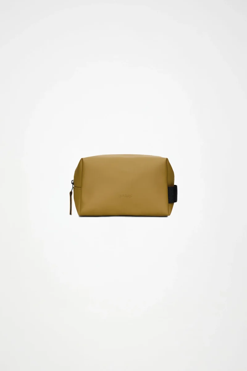 Wash Bag Small está confeccionado en el tejido de PU impermeable característico de Rains, diseñado para ofrecer robustez en el transporte, durabilidad y un suave acabado.