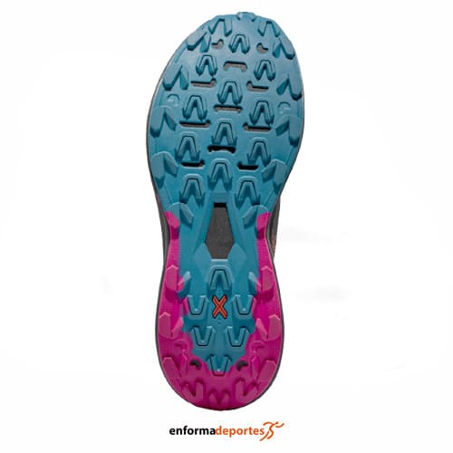 Zapatilla mujer LA SPORTIVA PRODIGIO, con upper de alta transpiración, con tecnología X Flow de alta amortiguación, con puntera reforzada, suela de doble componente Frixion® Red, plantilla Ortholite® Hybrid Mountain Running® Ergonomic 4 mm, rocker progresivo y drop de 6mm.