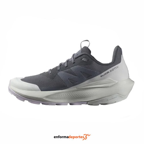 Zapatilla mujer SALOMON ELIXIR ACTIV GTX, fabricada con tecnología Activ GORE-TEX que ofrece la alianza perfecta de comodidad y apoyo equilibrado, con tecnología Active Chassis™ para una guía lateral, un suntuoso compuesto de entresuela y una geometría específica de la suela para una pisada fluida y cómoda, con cierre de cordones y suela de goma.